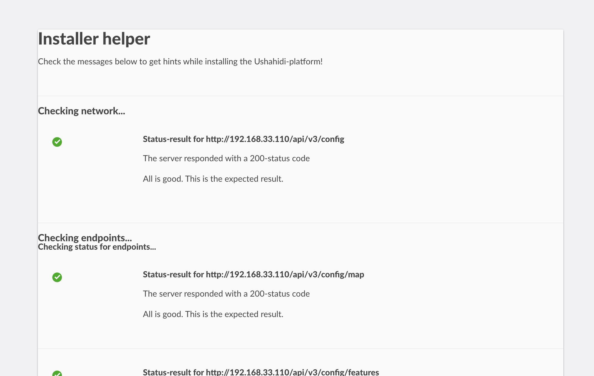 We are introducing a new feature to make it easier for open source deployers to identify and solve common problems during the installation process. To achieve this goal, the Ushahidi Platform now bundles an installation helper utility that can be used to gain information about the state of the installation.