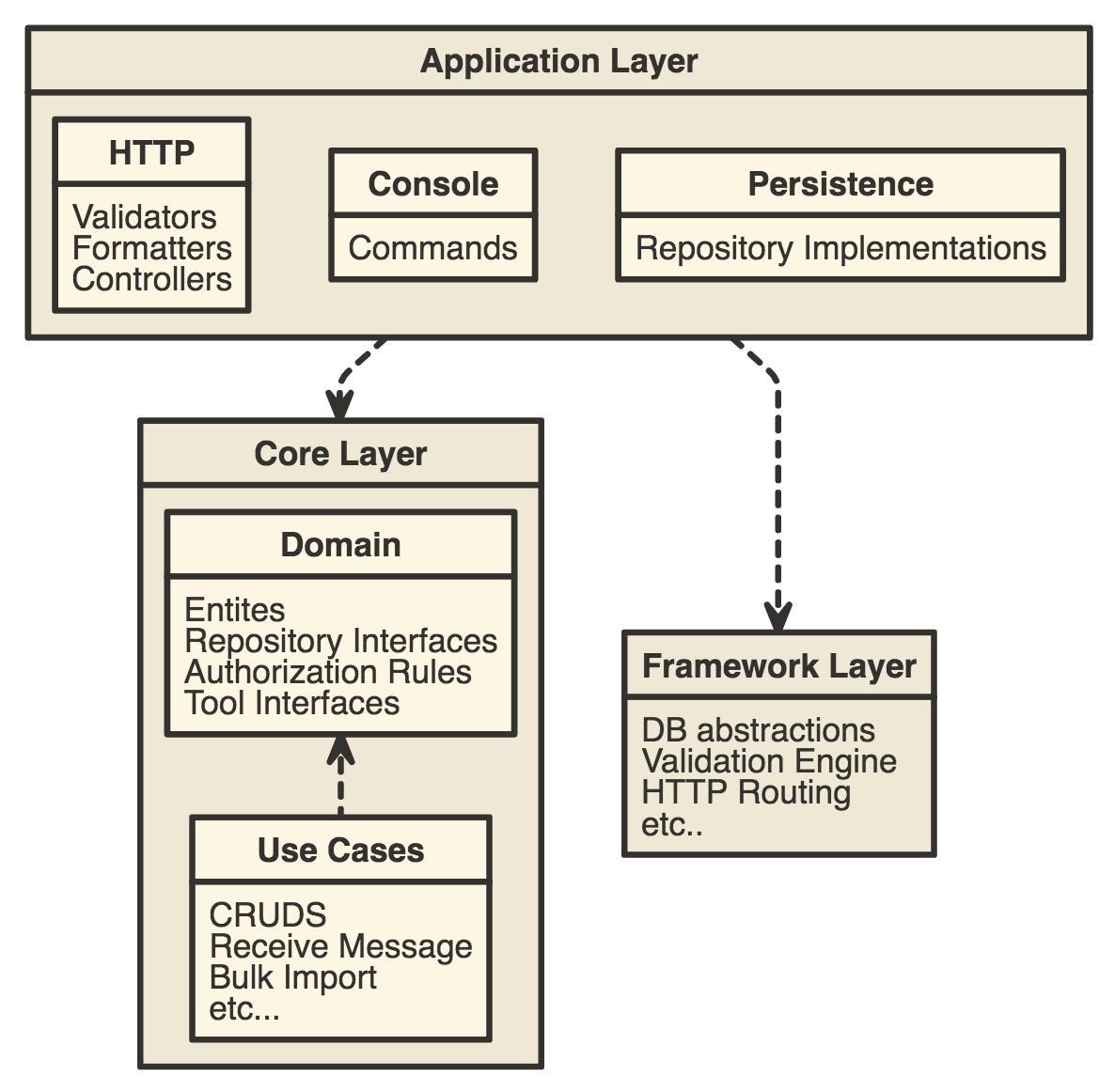The API layer consists of a core application (models, usecases, etc) and a delivery layer (routing and controllers). The core application is pure object-oriented PHP and the delivery mechanism is a PHP application built using the Kohana Framework.