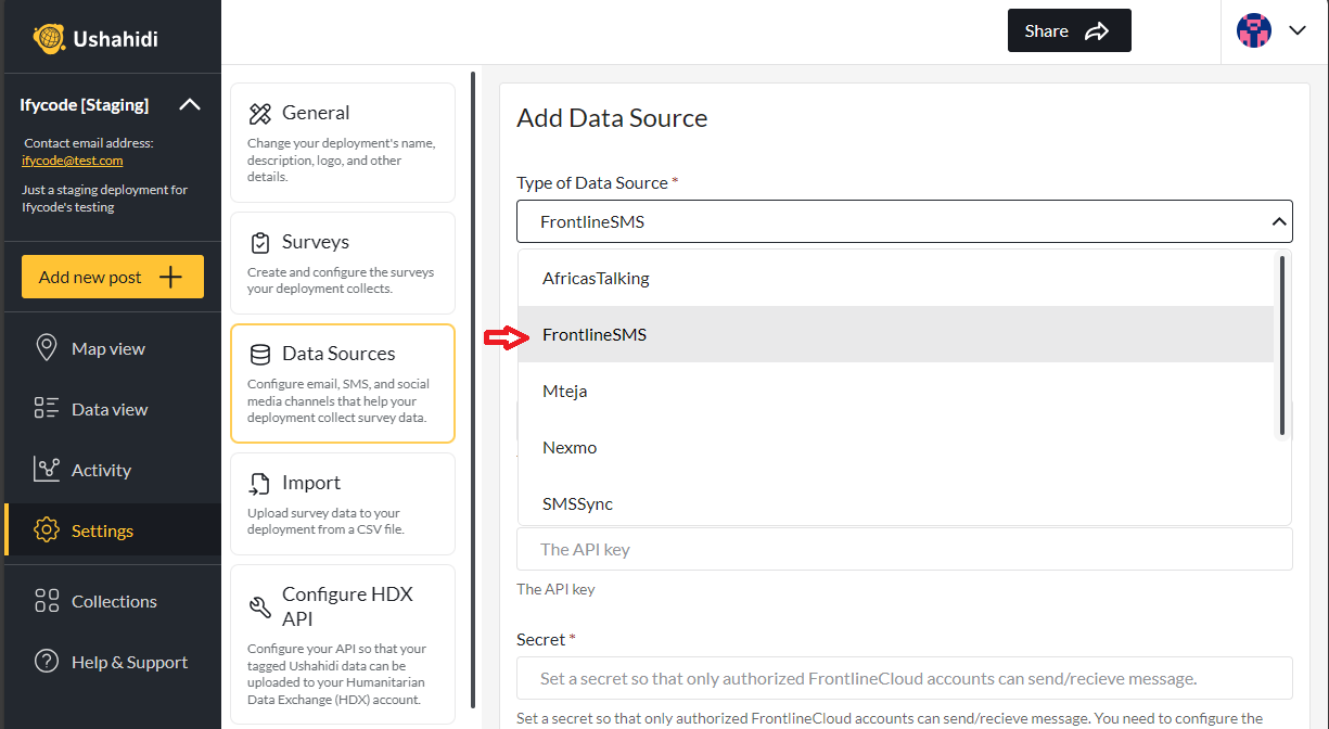 <figure><img src="https://1490970077-files.gitbook.io/~/files/v0/b/gitbook-x-prod.appspot.com/o/spaces%2FGBEUb85x3qZ9AiwfCkhF%2Fuploads%2FgFkYJGx48wuQ5nQpCowK%2F3.4.16.png?alt=media&#x26;token=d5818198-53bf-403b-a09b-963bd5a55b30" alt=""><figcaption><p>Data sources → Add Source -> Select FrontlineSMS to add configuration details for SMS provider</p></figcaption></figure>