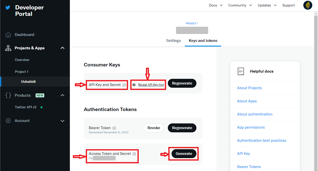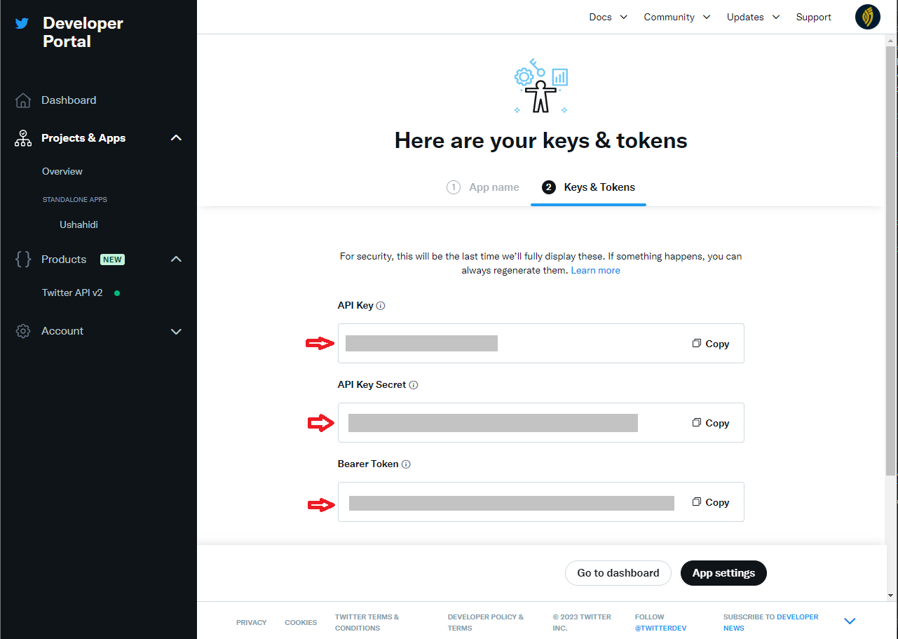 * Here, you will see the **API Key, API Key Secret,** and the **Bearer Token** generated for your app. ***Make sure to master or note down these codes safely since you will use them when filling out the form in the Ushahidi Platform.*** These codes can be generated later on as we will see in the process down below. ***Keep in mind that regenerating these keys might need you to update your code for your app to work properly.***
