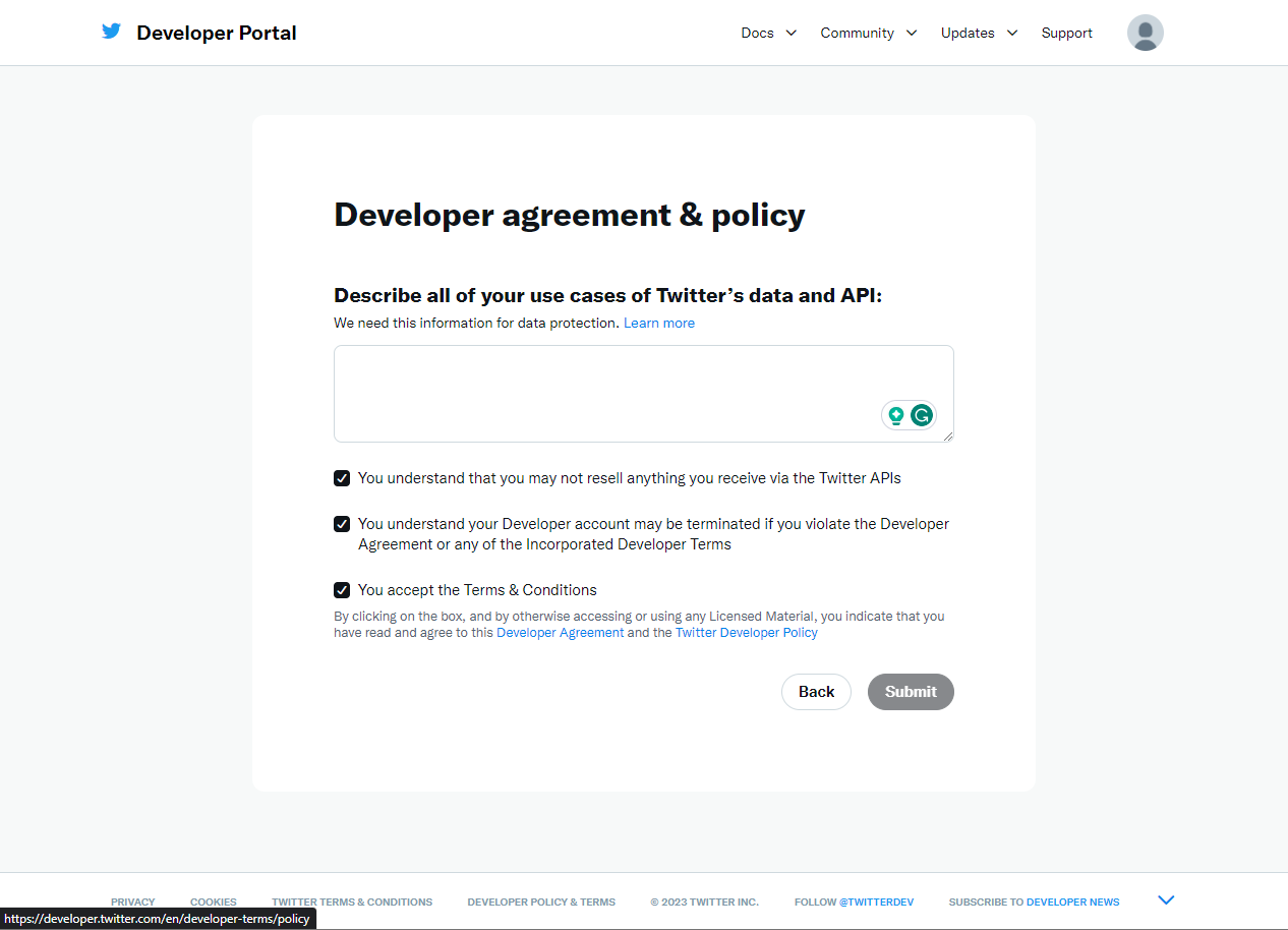 <figure><img src="https://content.gitbook.com/content/GBEUb85x3qZ9AiwfCkhF/blobs/jmlkZkk8ndkixeuZsgUp/Apply_%E2%80%94_Twitter_Developers.png" alt="Terms of Agreement"><figcaption><p>Terms of Agreement</p></figcaption></figure>