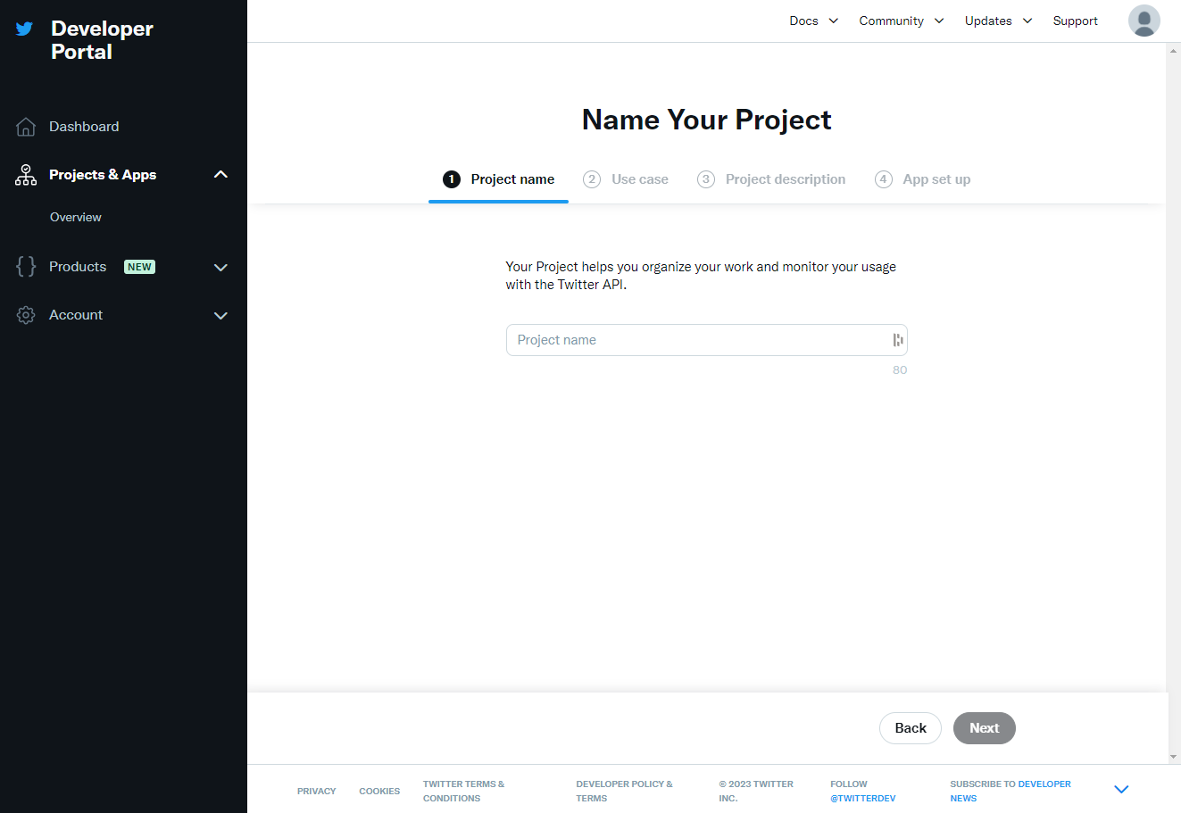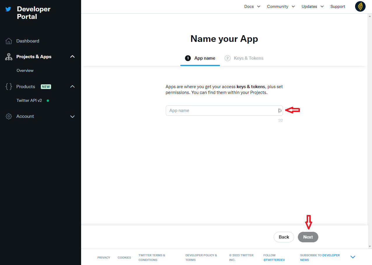 <figure><img src="https://content.gitbook.com/content/GBEUb85x3qZ9AiwfCkhF/blobs/aoXdZ4hVdhWgJvdQVVbv/Twitter_Developers.png" alt="Twitter (X) Developer Page - Enter your App/Deployment/Project name"><figcaption><p>Twitter (X) Developer Page - Enter your App/Deployment/Project name</p></figcaption></figure>