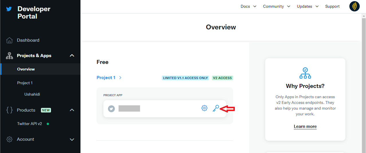 <figure><img src="https://content.gitbook.com/content/GBEUb85x3qZ9AiwfCkhF/blobs/Gk3UF8smmAVPvGbrS2dF/Twitter_Developers.png" alt="The overview page on Projects and Apps - key icon is highlighted by a red arrow."><figcaption><p>The overview page on Projects and Apps</p></figcaption></figure>