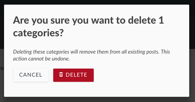 DELETE CATEGORY button on the bottom of the edit page. A pop up box will appear on the top of the page, prompting you to confirm whether you would like to delete the category/categories