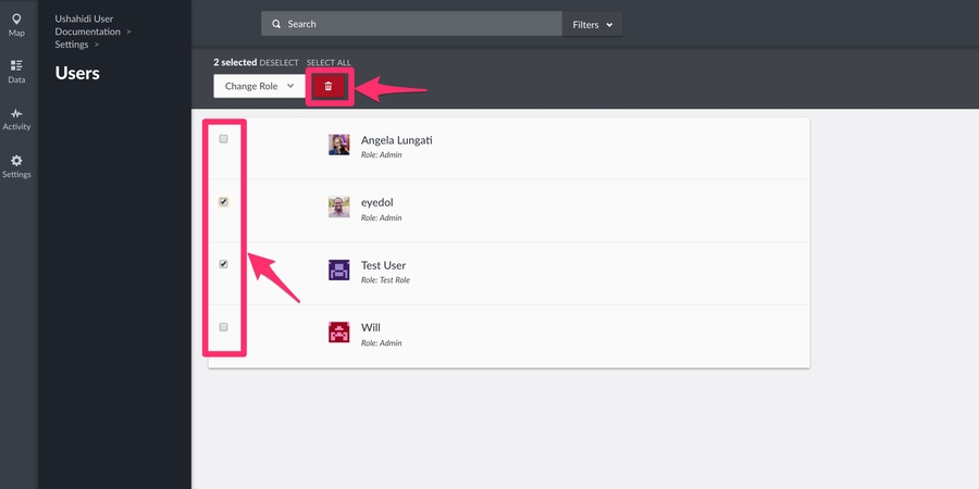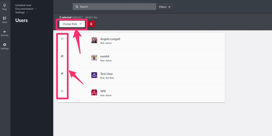 Tick the checkbox on the left, adjacent to the user(s) whose role you would like to change from the user list page