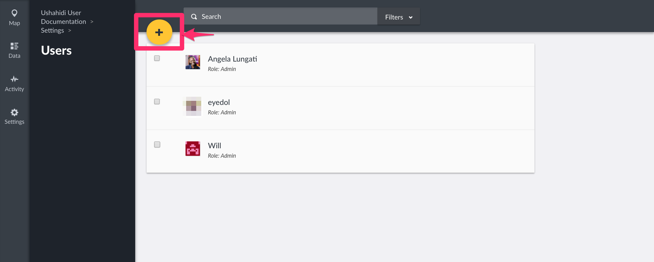 If you are an ushahidi.io user, you should see the the user you created on set up listed on this page. If you are an ushahidi open source user, every installation comes with a default username: admin and password: admin
