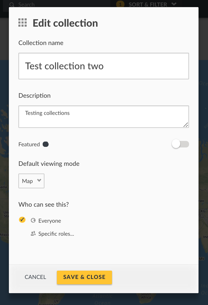 Set the default viewing mode for this collection (choosing between Map, Activity, or Data). This is the view that a user will see when they first arrive at this collection