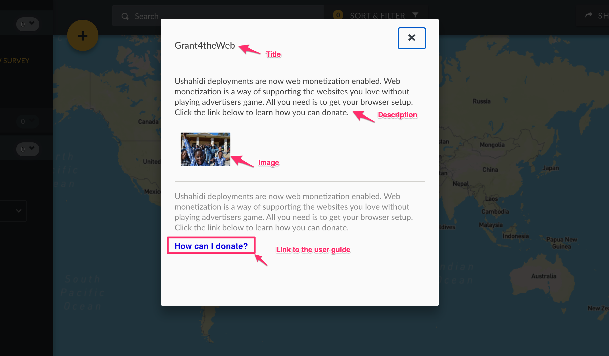 Reload your page and a donate button will appear at the top right corner of your deployment on the map view. This indicates that your deployment is monetizing and your sponsors can donate by clicking on the link that will redirect them to a user guide on how they can donate to your deployment.