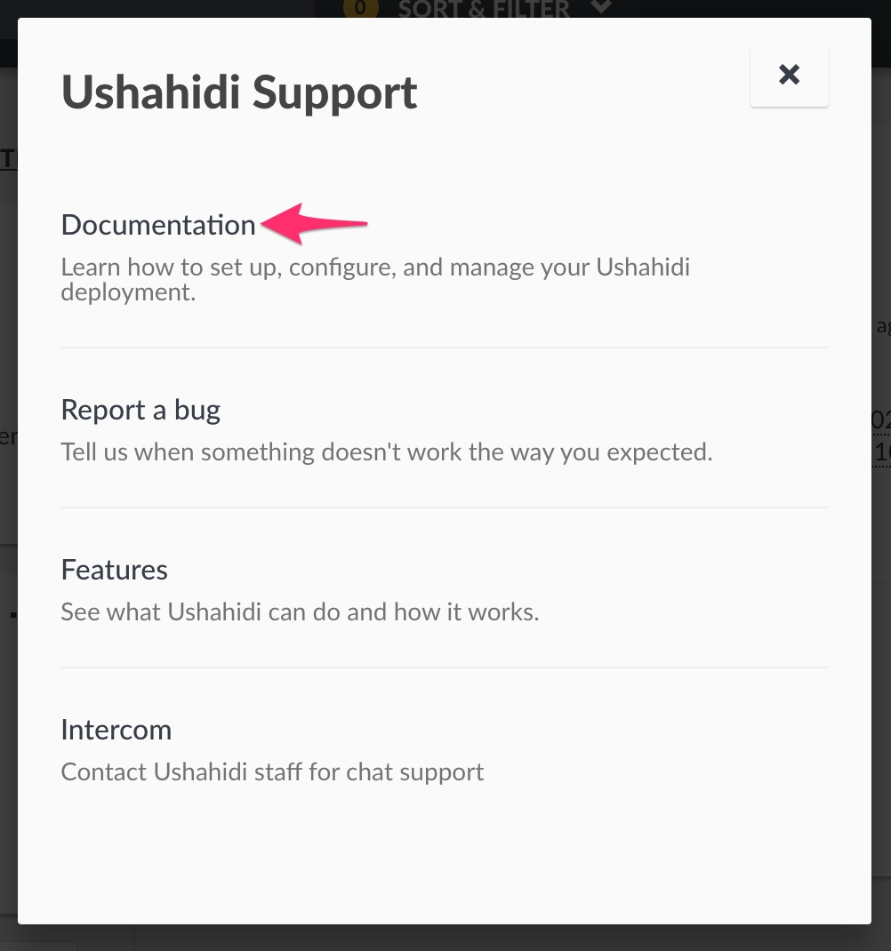 Clicking on the Ushahidi logo icon displays a pop up as shown below.