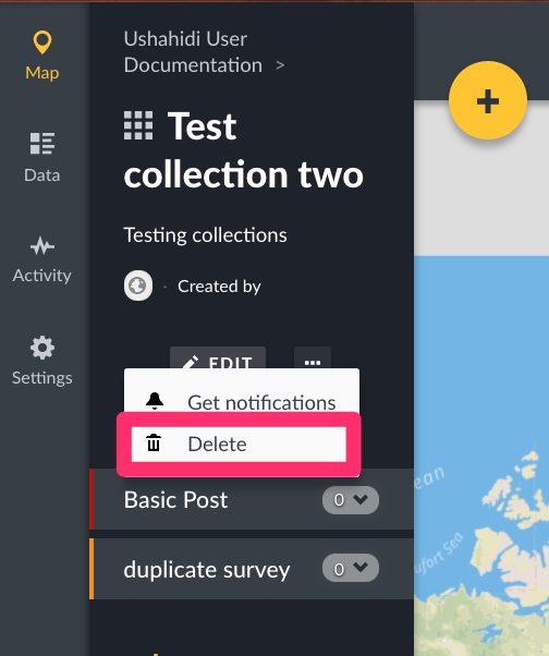 Click on Delete. A pop up box will appear on the top of the page, prompting you to confirm whether you would like to delete your collection.