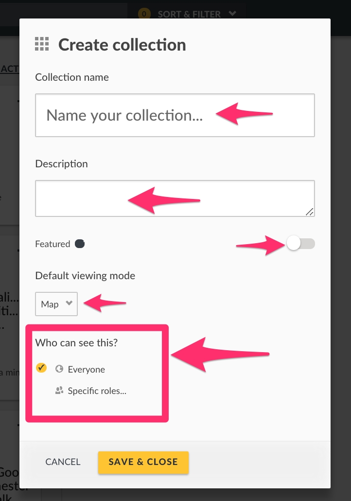 Set the default viewing mode for this collection (choosing between Map, Activity, or Data). This is the view that a user will see when they first arrive at this collection