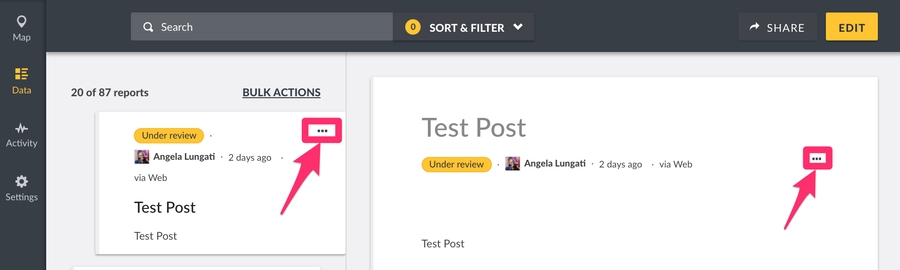 The three dotted icon on the data view page while viewing the list on the left and the detailed pane on the right. ( note that this will assign this post to the new collection created.